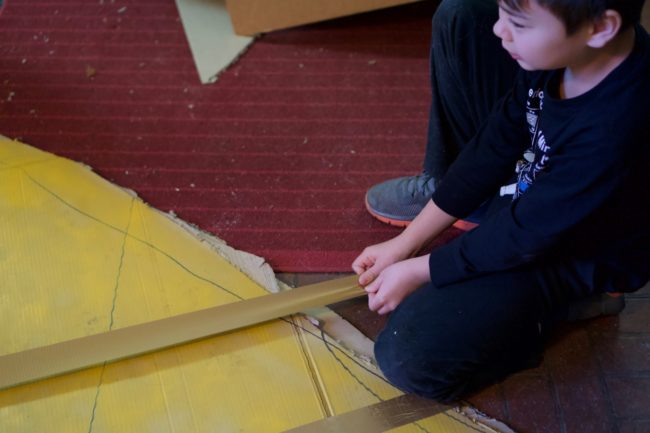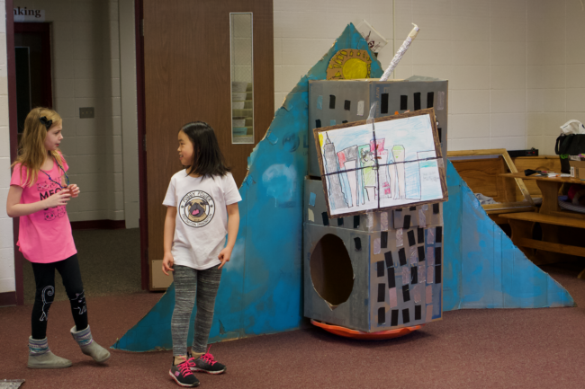 They had to create a skit in which they chose two cultures and create a prop that transforms into another prop (the technical part of the skit). They chose ancient Egypt and modern day America. Two members created the skit and the others created the props. But as we practiced the script, all the kids contributed to shaping the skit and they all worked on making the props functional. I really love the little jokes they put in and the idea to use a sled to help the prop turn.